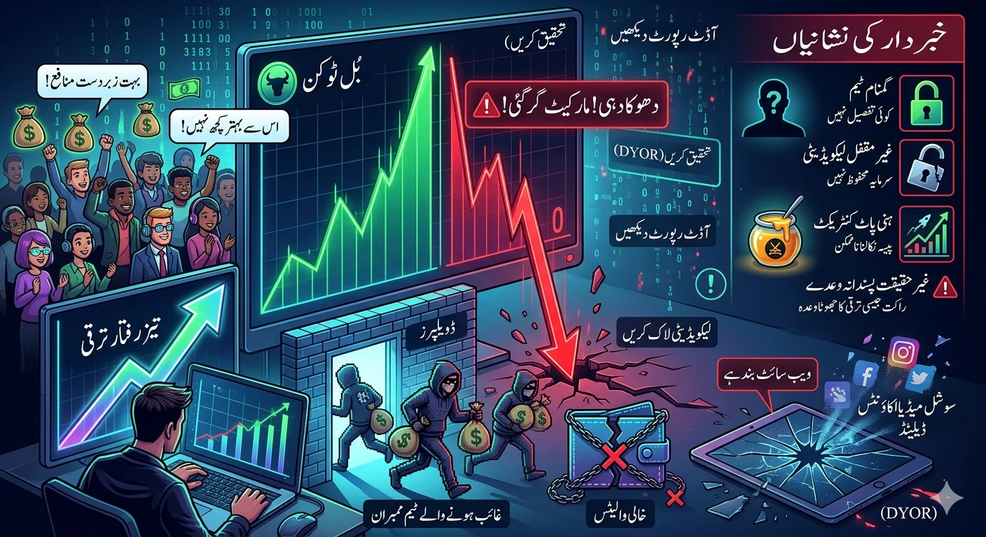 گزشتہ لمبے عرصے سے کرپٹو مارکیٹ (Crypto Market)میں ایک نئی قسم کی دھوکہ دہی (Scam) سر اٹھا رہی ہے جسے "رگ پل” Rug Pull کہا جاتا ہے۔ یہ وہ لمحہ ہوتا ہے جب ایک نیا ٹوکن لانچ ہوتا ہے، ہائپ بنتا ہے، قیمت آسمان چھوتی ہے اور پھر اچانک سب کچھ صفر ہو جاتا ہے۔ ڈویلپرز غائب، ویب سائٹ ڈاؤن، سوشل میڈیا خاموش اور سرمایہ کاروں کے پاس بیکار ٹوکنز رہ جاتے ہیں۔